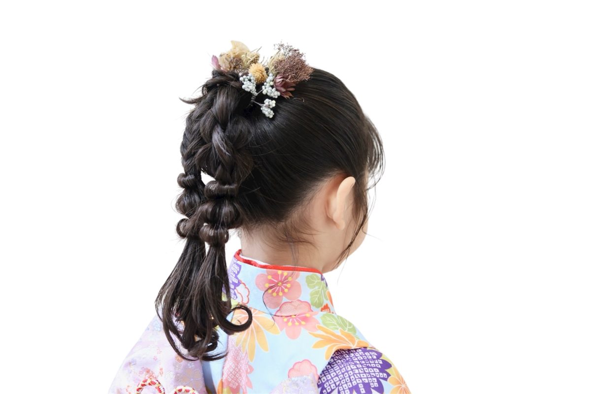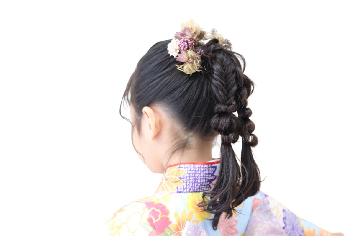高めポニーテールからツインでの編みおろしにしました。七五三、成人式、お呼ばれヘアと幅広いシーンで選ばれているスタイルです。